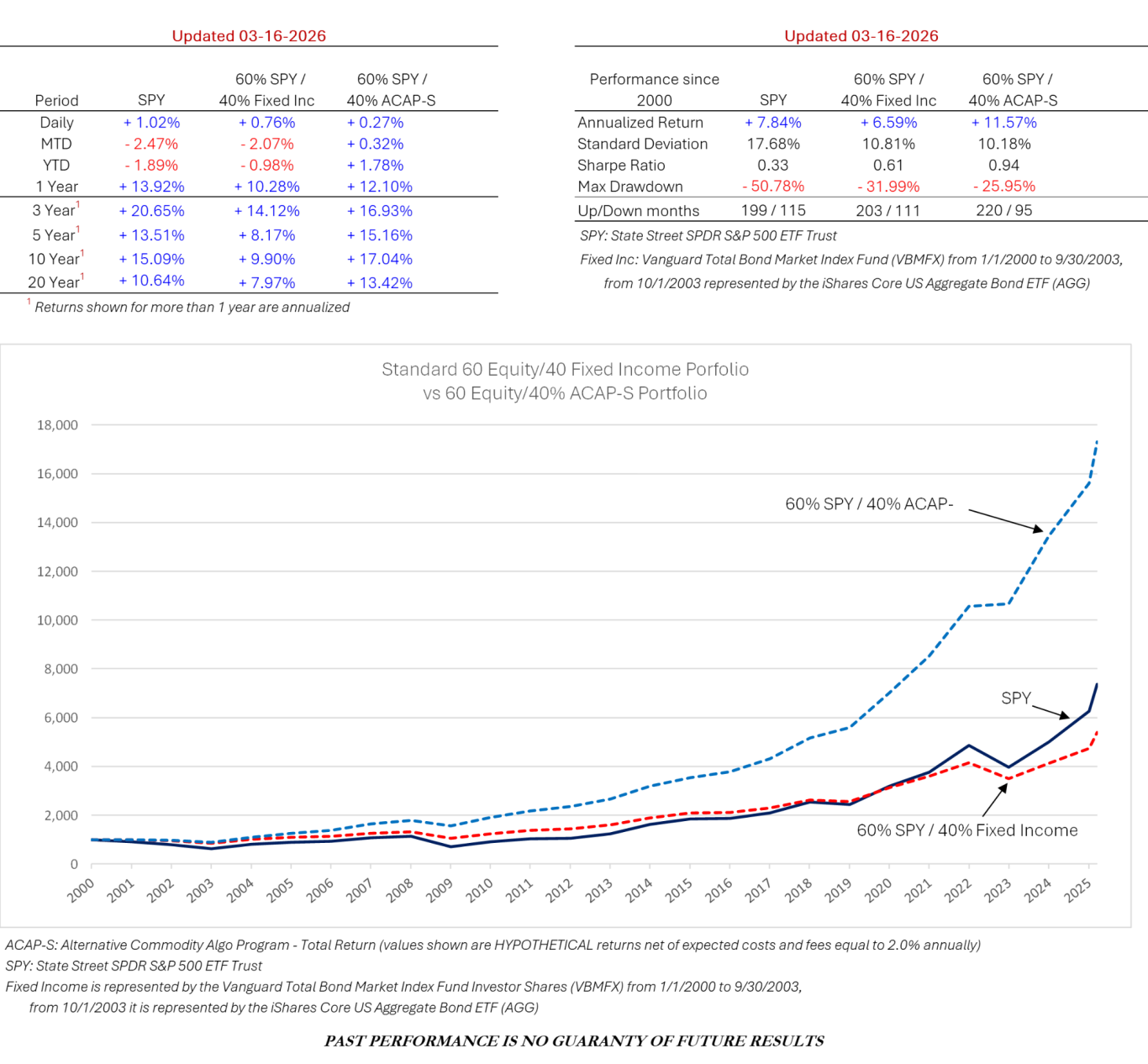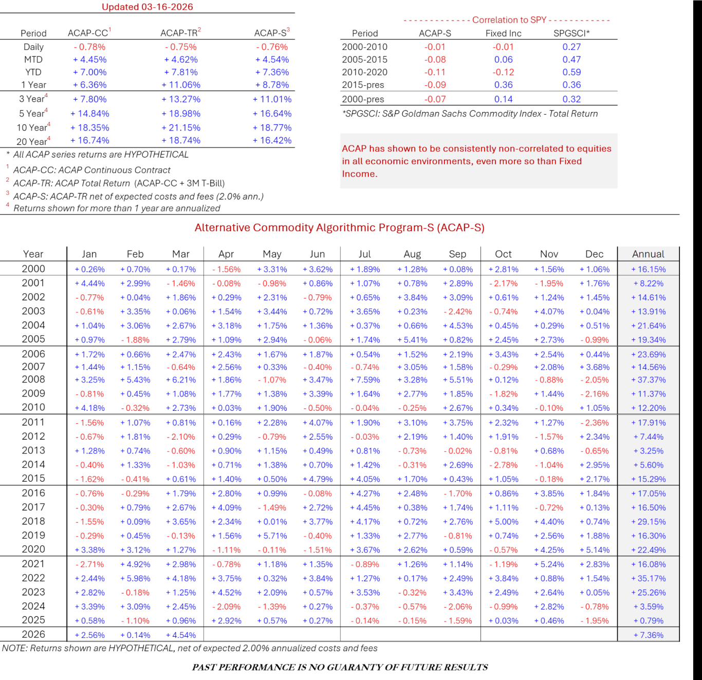 ACAP-S represents the ACAP-Total Return net of estimated costs and fees. ACAP-S allows for a more appropriate comparison versus investable fee-based commodity and managed futures programs.